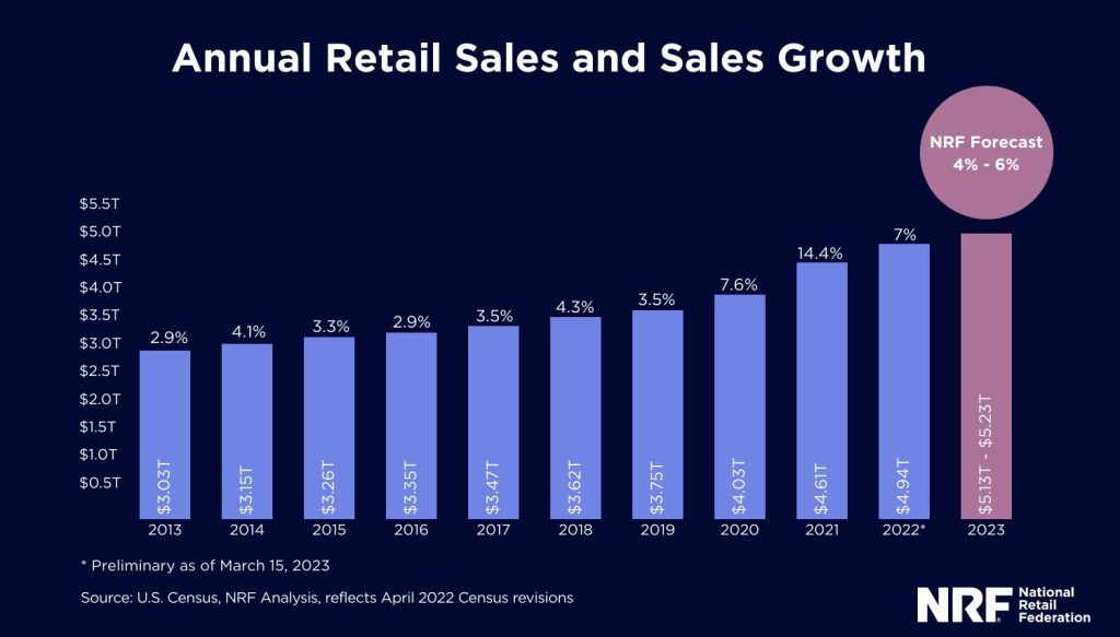 The National Retail Federation anticipates that retail sales will grow between 4% and 6% in 2023. In total, NRF projects that retail sales will reach between $5.13 trillion and $5.23 trillion this year.